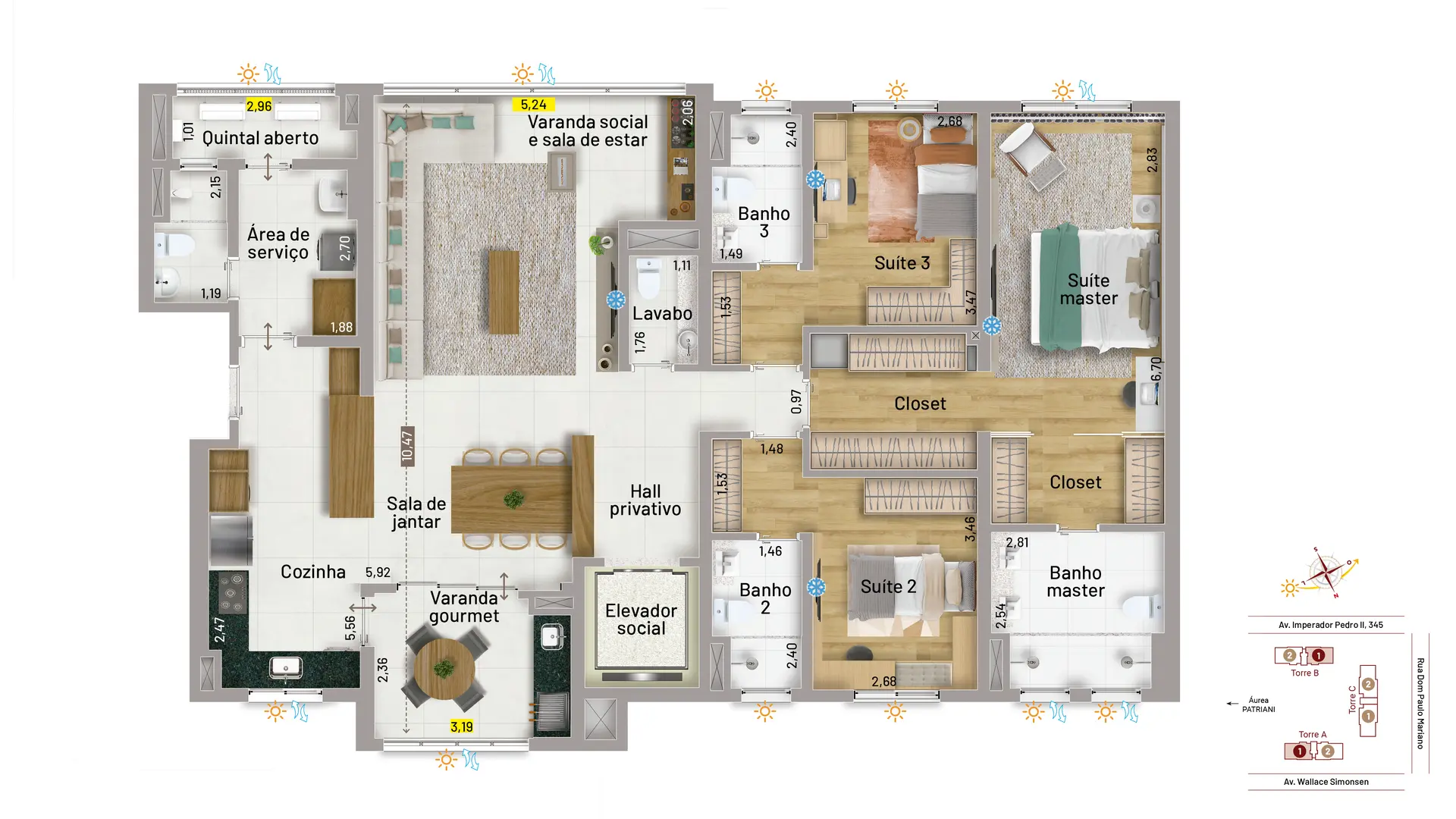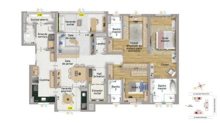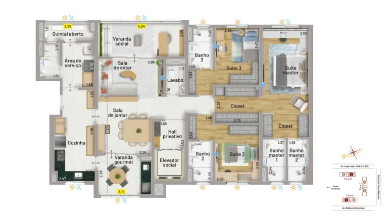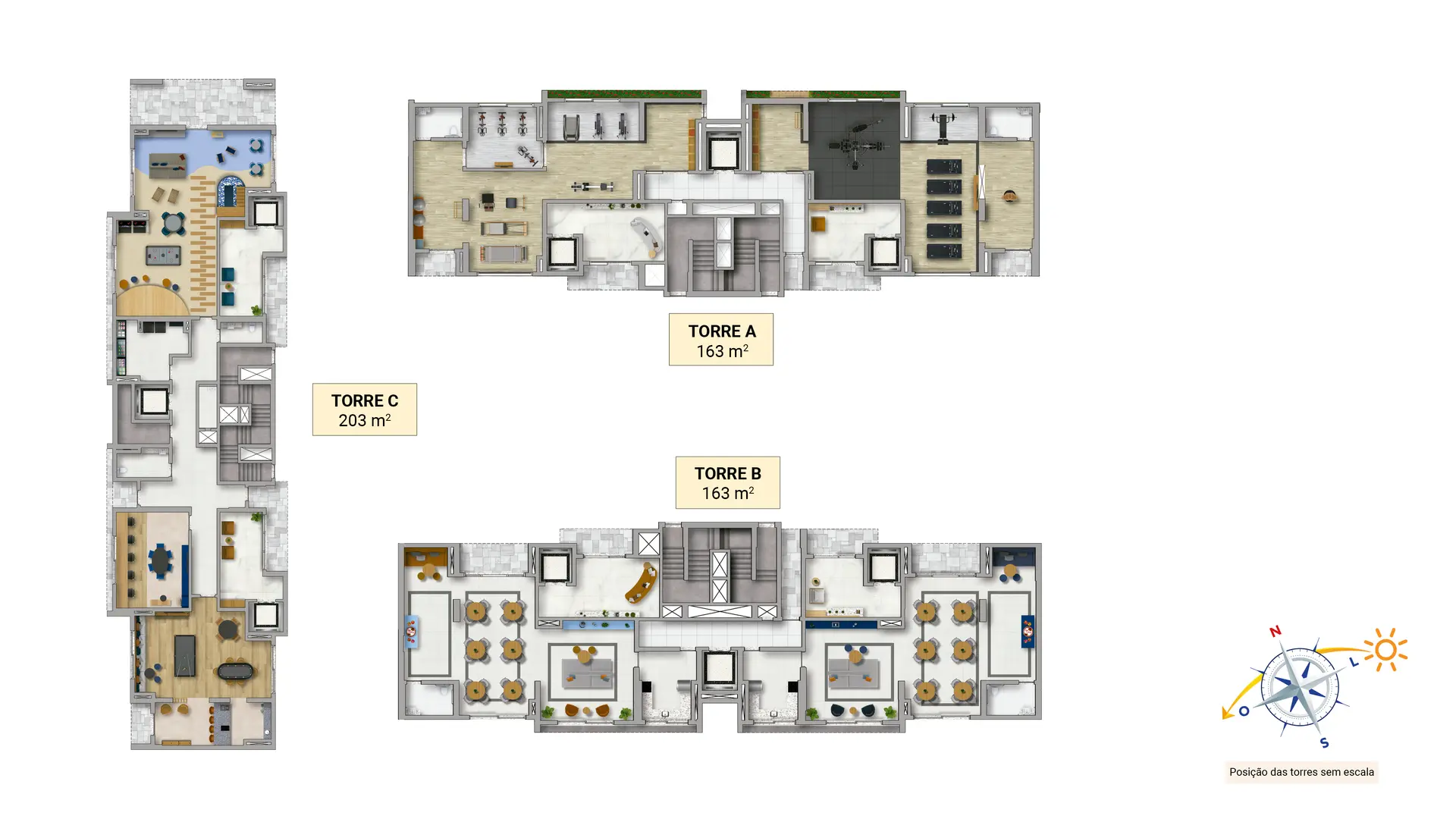 O condomínio oferece apartamentos à altura de sua área de lazer digna de um resort de luxo. As opções são verdadeiramente espetaculares: apartamentos de 163m², com 3 suítes e 3 vagas e de 203m², com quatro vagas e quatro suítes. Contam com duas varandas, sendo uma social e a outra gourmet com churrasqueira a carvão. Essa característica proporciona o benefício da ventilação cruzada, o que significa garantia de circulação de ar em todo o apartamento e muito mais ventilação e iluminação naturais