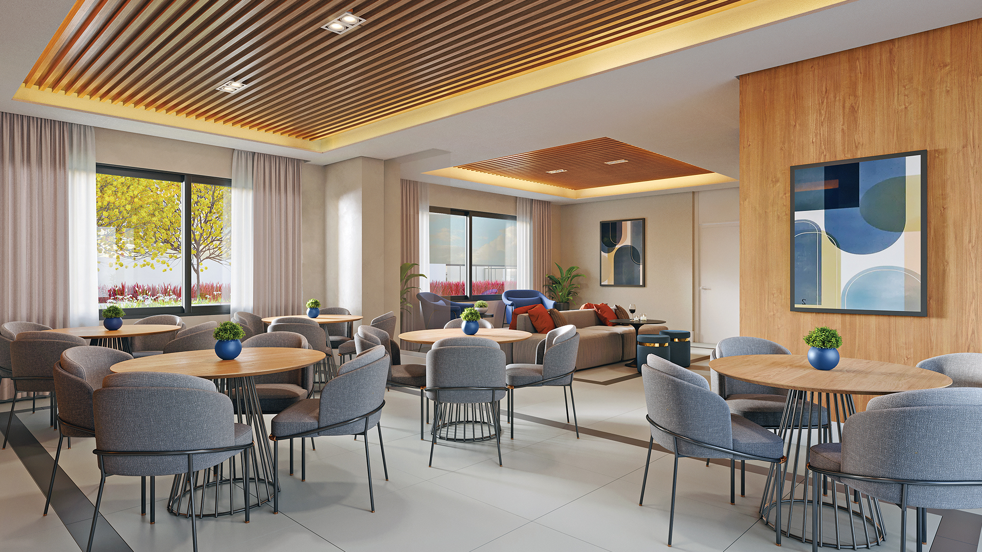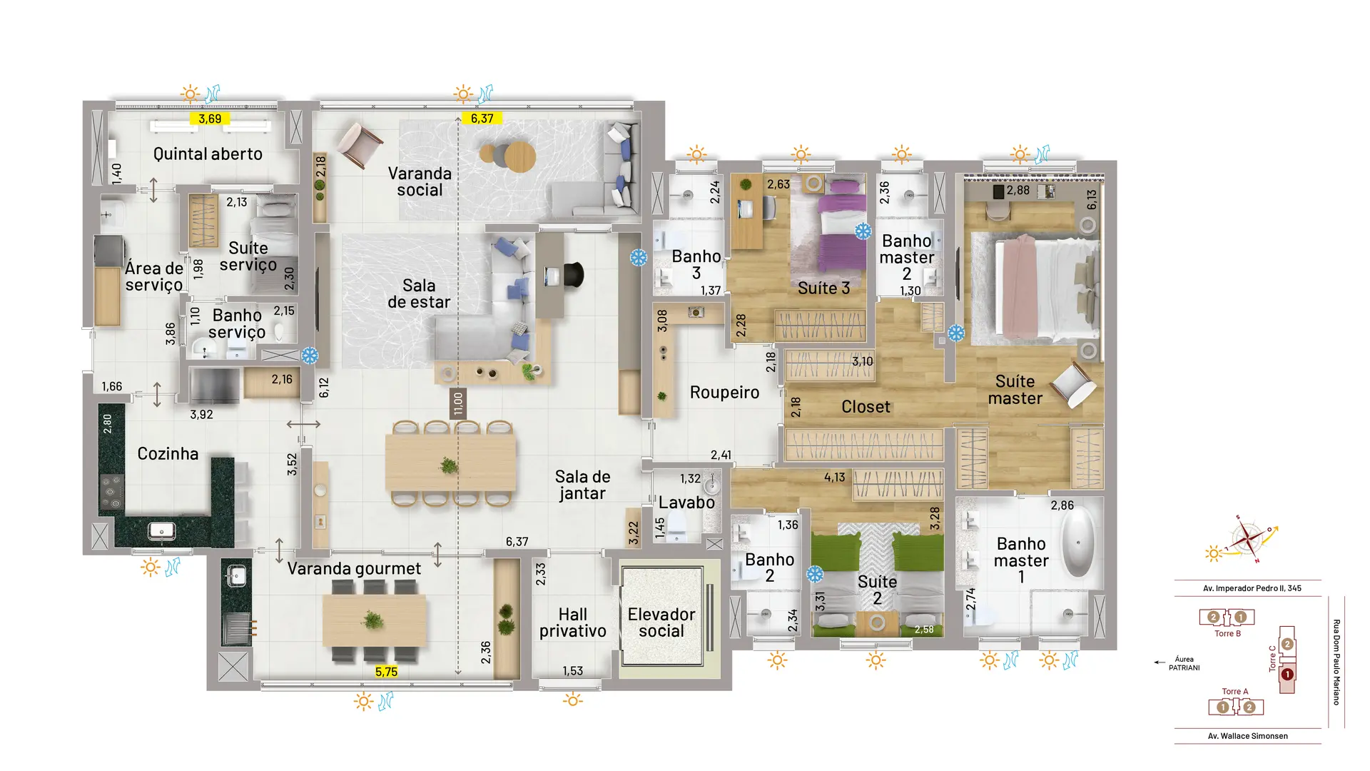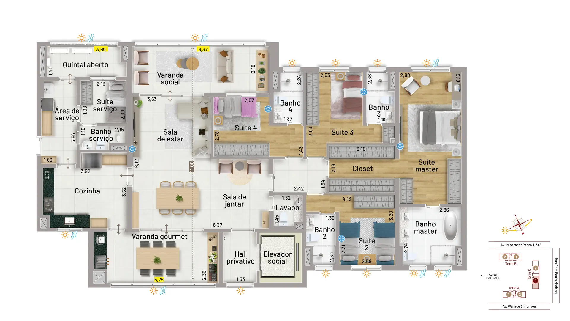 O condomínio oferece apartamentos à altura de sua área de lazer digna de um resort de luxo. As opções são verdadeiramente espetaculares: apartamentos de 163m², com 3 suítes e 3 vagas e de 203m², com quatro vagas e quatro suítes. Contam com duas varandas, sendo uma social e a outra gourmet com churrasqueira a carvão. Essa característica proporciona o benefício da ventilação cruzada, o que significa garantia de circulação de ar em todo o apartamento e muito mais ventilação e iluminação naturais