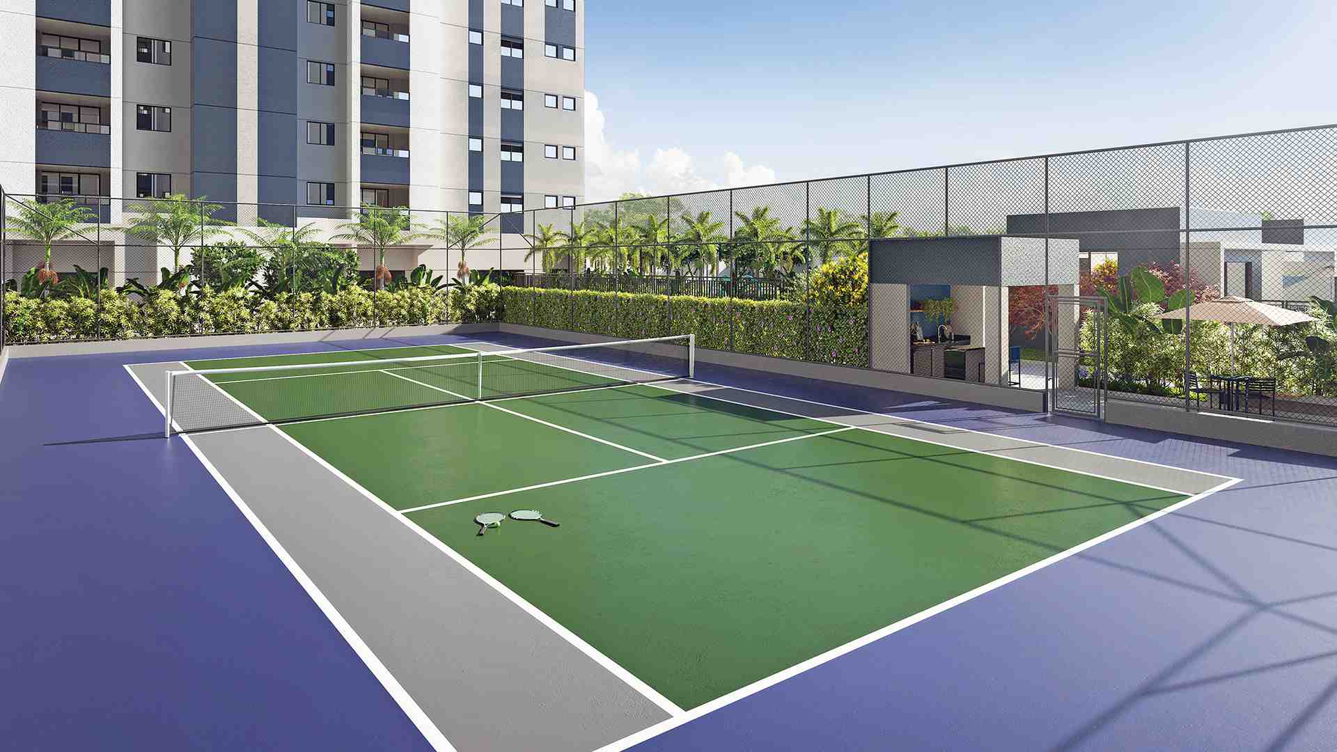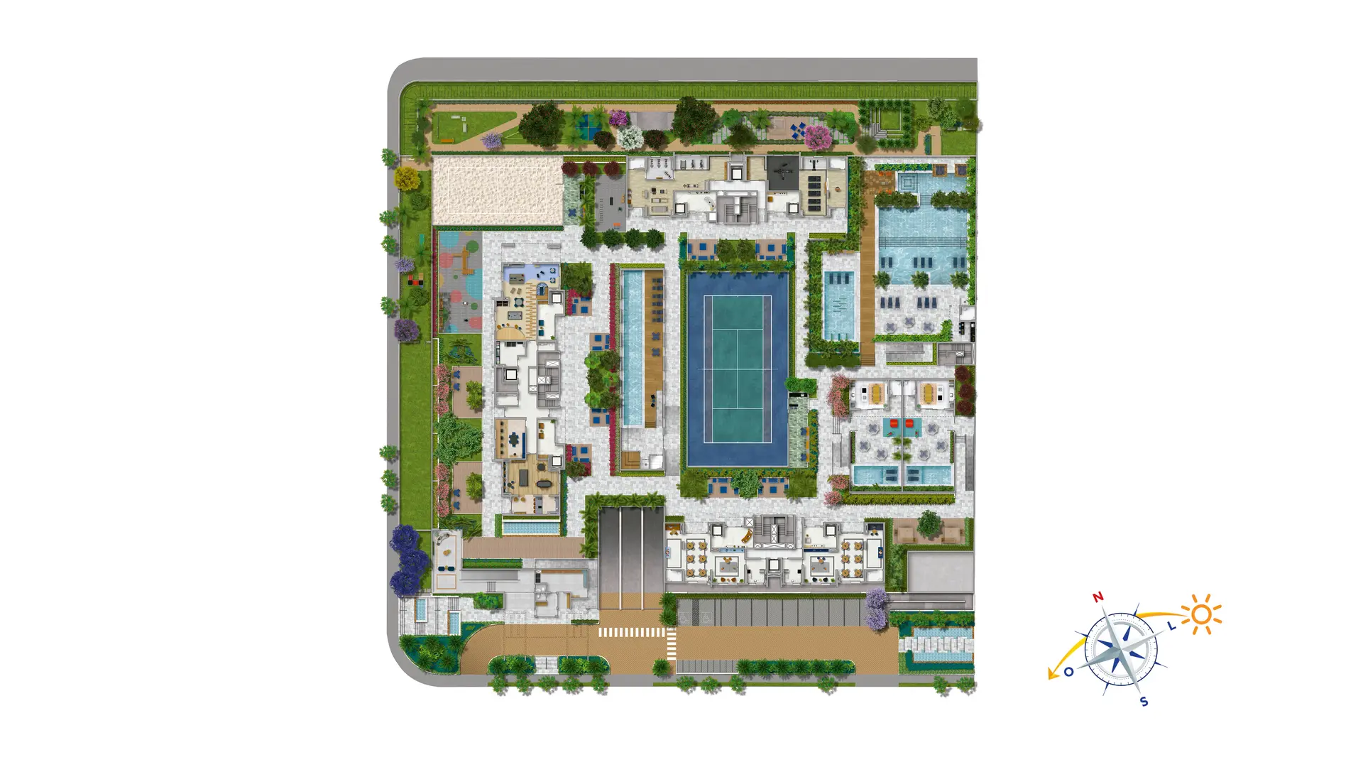Destaque para a quadra de tênis, inédita na região, e um deslumbrante complexo aquático, incluindo uma piscina da família com entrada de prainha, proporcionando a sensação de estar em Bali.